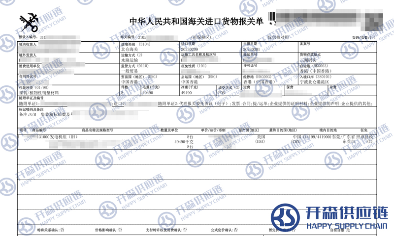 【本文結語】 上述就是廣州黃埔港舊發(fā)電機組進口報關清關代理服務【經典案例】的全部內容,希望能對您有所幫助,如有二手機械進口報關上任何疑問及問題可隨時在線聯(lián)系我們或撥打 18002611553,開森供應鏈擁有豐富的二手機械進口報關操作經驗及案例,10余年進口經驗為您所用,各類進口疑難都能為您一一解答及協(xié)助快速處理解決!
