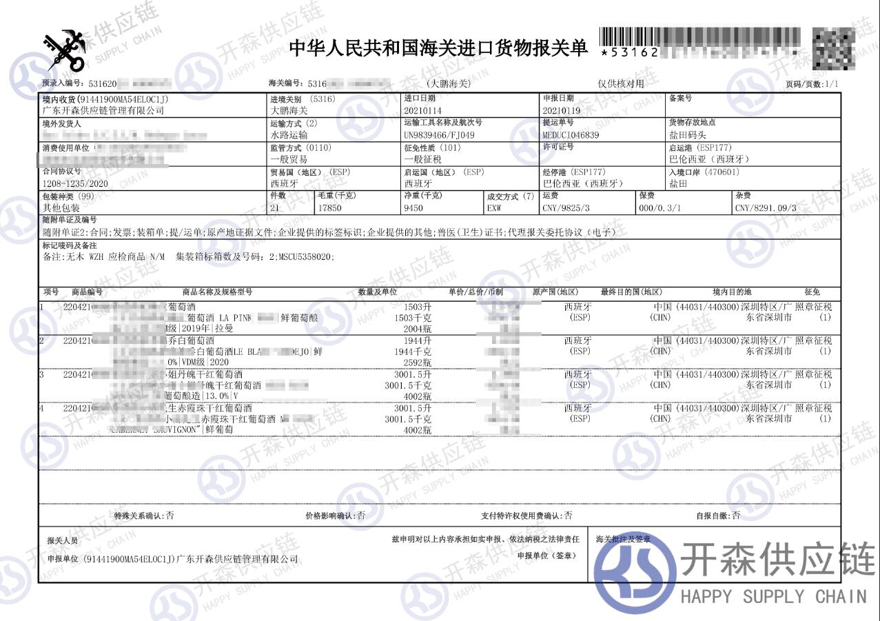 上述就是【進口案例】西班牙葡萄酒進口報關(guān)代理服務的全部內(nèi)容,希望能對您有所幫助,如有葡萄酒進口報關(guān)上任何疑問及問題可隨時在線聯(lián)系我們或撥打 18002611553,開森供應鏈擁有豐富的葡萄酒進口報關(guān)操作經(jīng)驗及案例,10余年進口經(jīng)驗為您所用,各類進口疑難都能為您一一解答及協(xié)助快速處理解決!