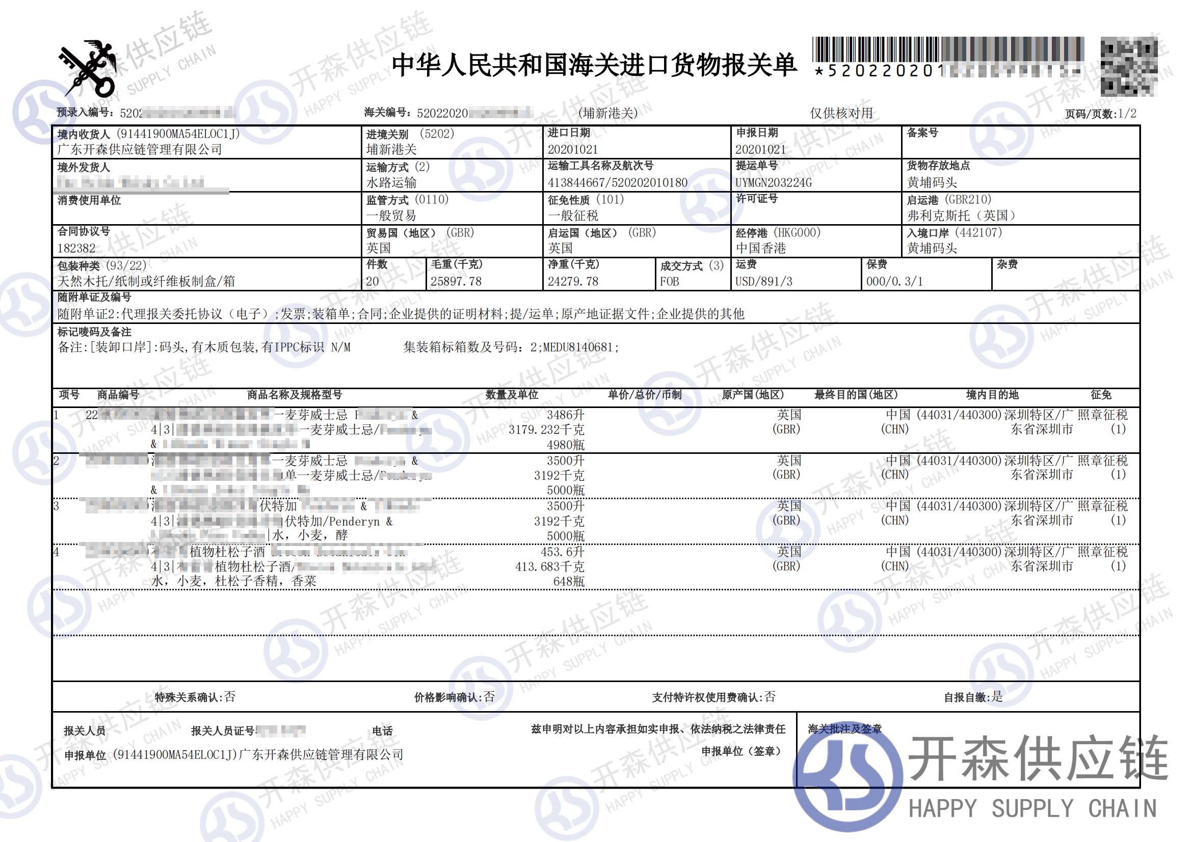 從英國威爾進口一批威士忌等酒到黃埔碼頭,我司提供門到門進口一站式清關服務,開森擁有十余年食品進口清關經(jīng)驗及案例,為客戶提供量身制作的進口方案,讓客戶進口省時省心省成本。