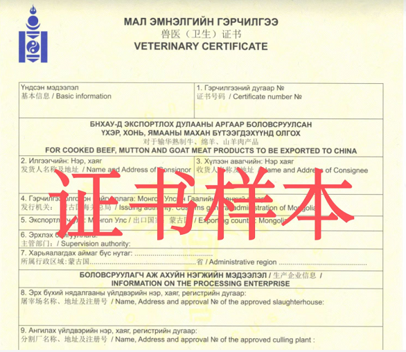 蒙古國(guó)官方已向中國(guó)海關(guān)總署備案確認(rèn)蒙古國(guó)熟制牛羊肉產(chǎn)品獸醫(yī)衛(wèi)生證書(shū)樣式、官方印章及官方獸醫(yī)簽字等相關(guān)信息。進(jìn)口蒙古國(guó)熟制牛羊肉產(chǎn)品應(yīng)附有蒙古國(guó)官方出具的獸醫(yī)衛(wèi)生證書(shū),并加蓋官方印章和官方獸醫(yī)簽字,同時(shí)向中國(guó)海關(guān)推送對(duì)應(yīng)蒙古國(guó)輸華肉類(lèi)衛(wèi)生證書(shū)電子信息。